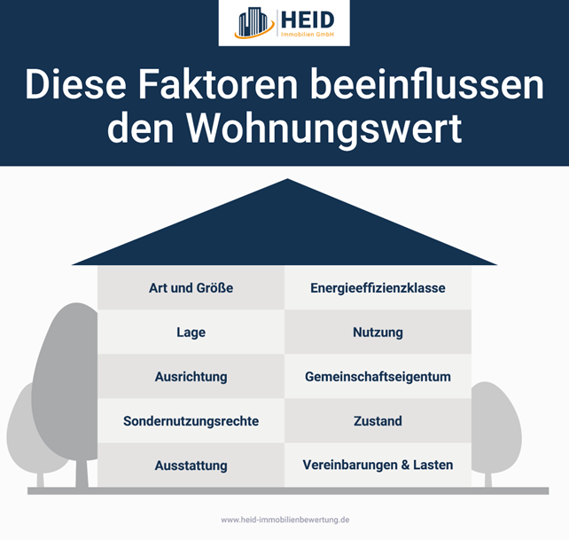 Zahlreiche Faktoren bestimmen den Wert einer Eigentumswohnung: Er wird durch die Lage, die Art und Größe der Wohnung, die Ausrichtung, den Zustand, die Ausstattung, die Energieeffizienzklasse, die vorangegangene Nutzung, vorhandenes Gemeinschaftseigentum und Sonderrechte sowie eventuell vorhandene Lasten beeinflusst. Alle diese Faktoren müssen bei der Berechnung berücksichtigt werden.