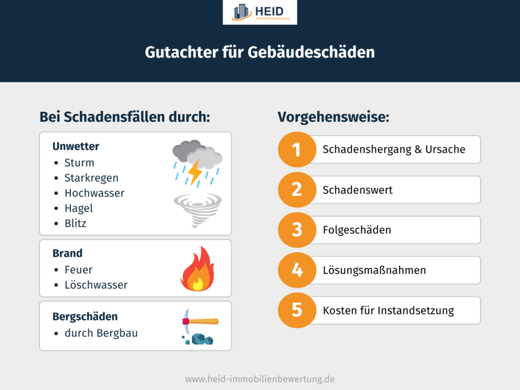 - Ein Gutachter für Gebäudeschäden kommt zum Einsatz, wenn Brände oder Unwetterereignisse wie Hochwasser, Stürme und Gewitter Ihre Immobilie beschädigt haben. Auch bei Bergbauschäden am Haus können Sie einen fachkundigen Gutachter einschalten.