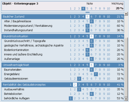 Die Kriteriengruppe „Objekt“ besteht aus Werten, die auf die Aspekte Architektur, Ausstattung, baulichen Zustand, Grundstückssituation, Rentabilität des Gebäudekonzepts sowie die Umweltverträglichkeit einschließlich der