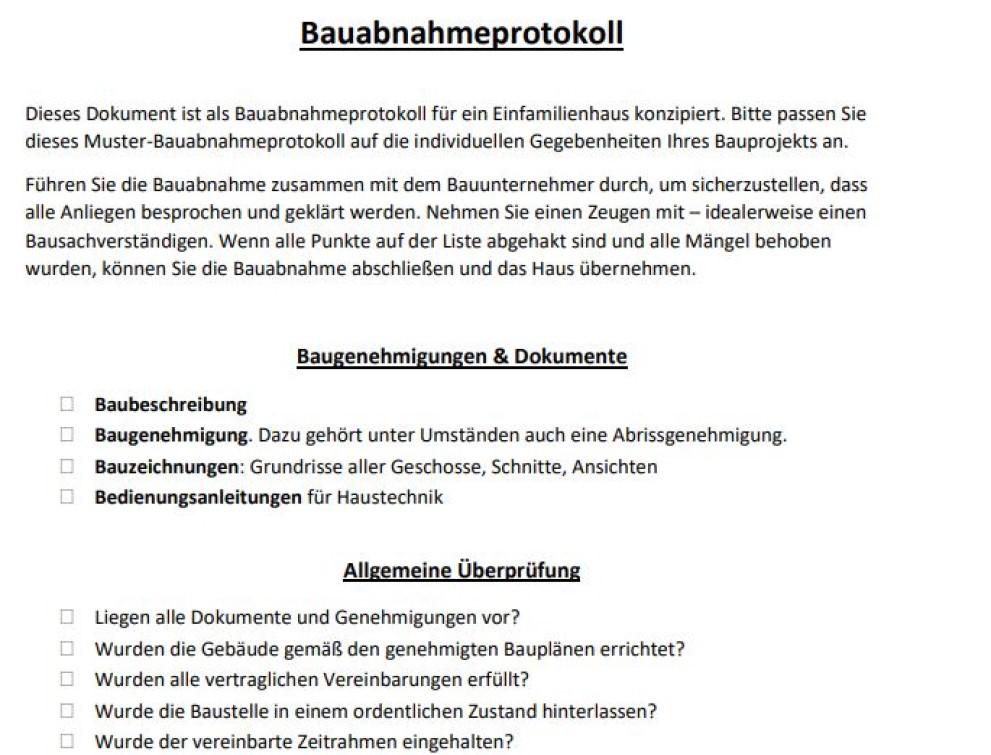 Bauschäden können bei der Bauabnahme erfasst werden. Protokollieren Sie alle Bauschäden, setzen Sie Deadlines für Nachbesserungen und lassen Sie den Bauträger unterzeichnen. Wir haben Ihnen ein Muster-Protokoll zum kostenlosen Download zur Verfügung gestellt.