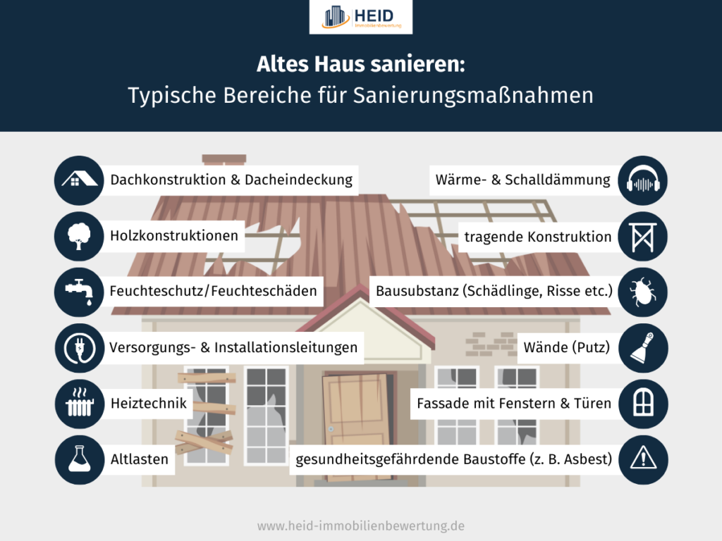 - Wann muss ein Haus saniert werden? Die Notwendigkeit von Sanierungsmaßnahmen beziehungsweise ihr Umfang ist für Laien häufig nur schwer zu beurteilen. Ein sachkundiger Gutachter kann bei einer Begehung der Immobilie feststellen, welche Mängel und Schäden, etwa in der Bausubstanz, vorliegen. Sein Gutachten dient als Basis für die Renovierung oder Sanierung des Gebäudes – von der Reihenfolge beim Sanieren eines Altbaus bis zu den Kosten, die auf Eigentümer zukommen, wenn sie ein altes Haus renovieren.