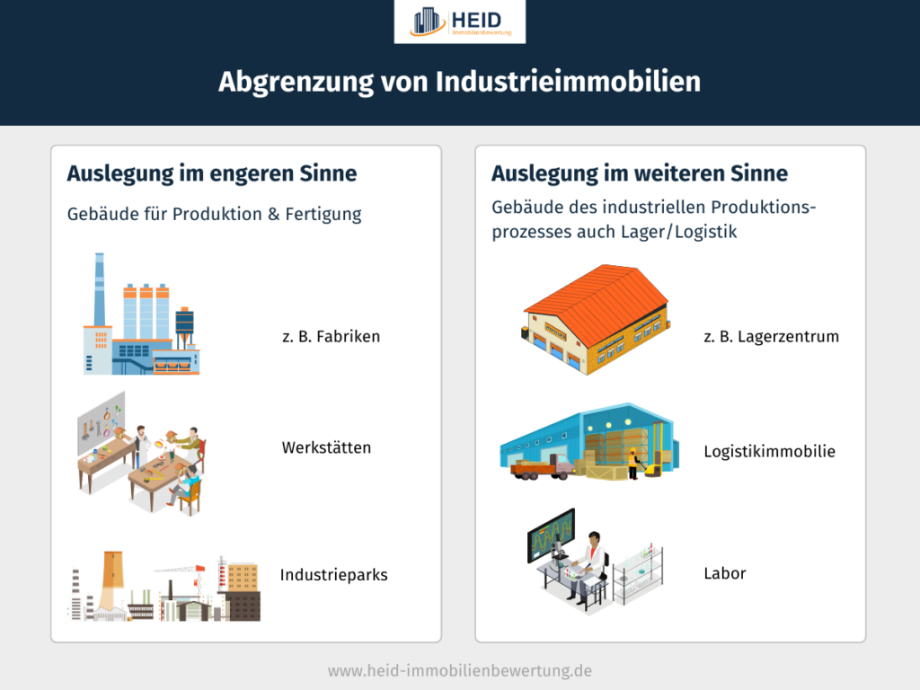 Am Markt gibt es unterschiedliche Auffassungen darüber, welche Gebäudetypen in die Sparte der Industrieimmobilien fallen. Grundsätzlich sind sie eine Form von Gewerbeimmobilien, die sich auf zwei mögliche Weisen näher eingrenzen lassen: