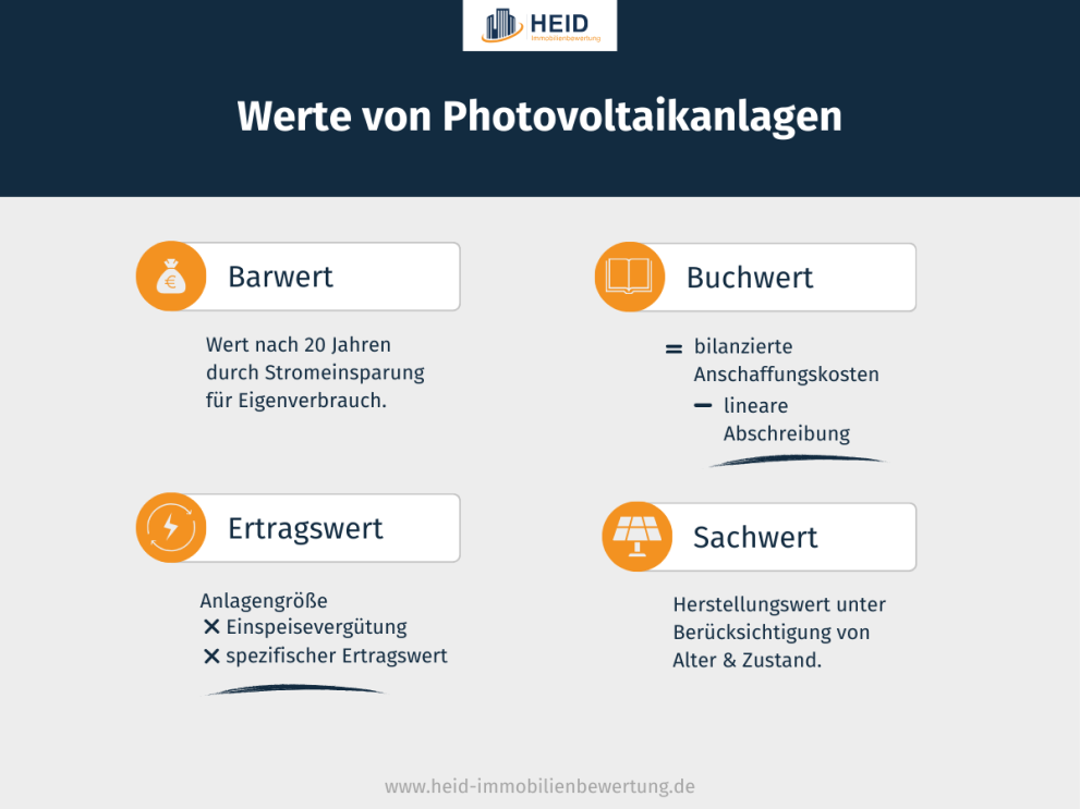 - Keines der etablierten Bewertungsverfahren passt perfekt für die Wertermittlung von Photovoltaikanlagen. Ein modifiziertes Ertragswertverfahren kommt dem Wert der Solaranlage am nächsten. Je nach Grund für die Bewertung kann statt dem Ertragswert der Sach-, Buch- oder Restwert berechnet werden.