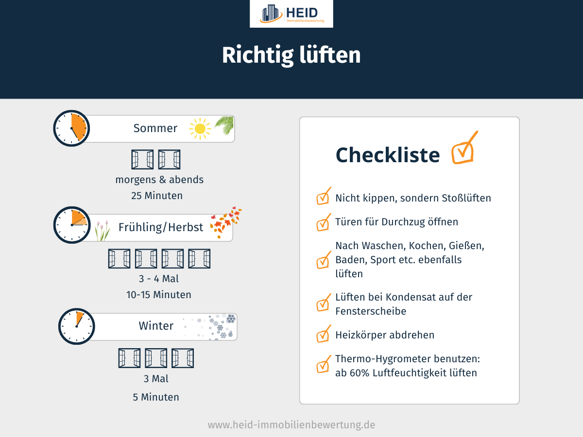 Streng genommen gibt es für jede Jahreszeit andere Vorgaben, wie (oft) gelüftet werden sollte. Der renommierte Heizungshersteller Viessmann empfiehlt folgende Intervalle für das tägliche Stoßlüften, um Schimmel vorzubeugen: