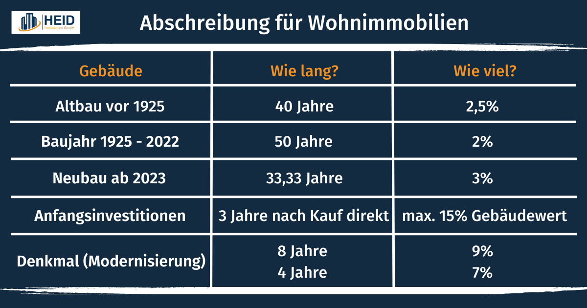 - Wohngebäude, die zwischen 1925 und 2022 errichtet wurden, werden über 50 Jahre – zu je zwei Prozent abgeschrieben,