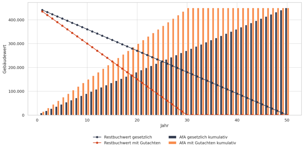 Beispiel: Ein Gebäude mit einem Anschaffungswert von 450.000 Euro soll laut Gesetz über 50 Jahre abgeschrieben werden – das ergibt eine jährliche AfA von 9.000 Euro. Wird jedoch durch ein Restnutzungsdauer-Gutachten eine tatsächliche Nutzungsdauer von nur 30 Jahren nachgewiesen, steigt die jährliche AfA auf 15.000 Euro. Die Investition in das Gutachten macht sich durch die höhere steuerliche Entlastung meist schon nach kurzer Zeit bezahlt.