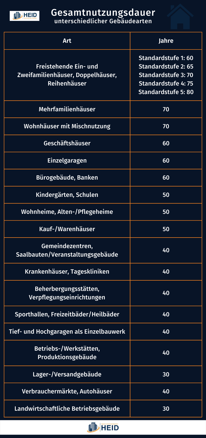 Die Gesamtnutzungsdauer ist im Bewertungsgesetz (BewG) genau definiert: Sie bezeichnet den Zeitraum, in dem eine bauliche Anlage entsprechend ihrer Zweckbestimmung nach wirtschaftlich vernünftigen Gesichtspunkten nutzbar ist. Bei Mehrfamilienhäusern beträgt diese 70 Jahre. Bei Krankenhäusern und Tageskliniken werden 40 Jahre Gesamtnutzungsdauer veranschlagt. Landwirtschaftliche Betriebsgebäude sind mit einer Gesamtnutzungsdauer von 30 Jahren zu bewerten, wohingegen bei Bürogebäude und Banken mit einer Gesamtnutzungsdauer von 60 Jahren gerechnet wird. Die höchste Gesamtnutzungsdauer mit 80 Jahren besitzen freistehende Ein- und Zweifamilienhäuser, Doppelhäuser und Reihenhäuser der Standardstufe 5.