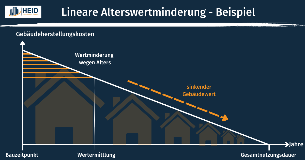Die lineare Alterswertminderung beschreibt eine gleichmäßig verlaufende Wertminderung eines Objektes über Jahre hinweg. Bei der Entstehung sind Gebäudenormalherstellungskosten von 100 Prozent vorhanden. Gemäß Sachwertrichtlinie SW-RL Nr. 4.3 wird die lineare Alterswertminderung in einem Vomhundertsatz der Gebäudeherstellungskosten ausgedrückt. Sofern es sich nicht um einen Neubau handelt, müssen Sachverständige das Verhältnis der wirtschaftlichen Restnutzungsdauer zur Gesamtnutzungsdauer des Gebäudes berücksichtigen. Die Formel zur Berechnung der linearen Alterswertminderung lautet: