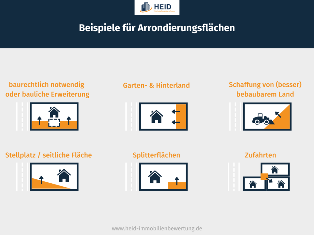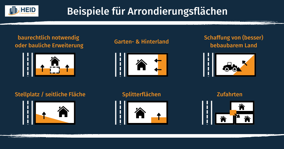 Laut dem Bericht „Verkehrswertermittlung von Grundstücken“ von Wolfgang Kleiber lassen sich in der Bauplanung unter anderem Arrondierungsflächen an bebauten Grundstücken und solche zur Schaffung einer Bebaubarkeit unterscheiden. An bebauten Grundstücken ergeben sich beispielsweise Arrondierungen für