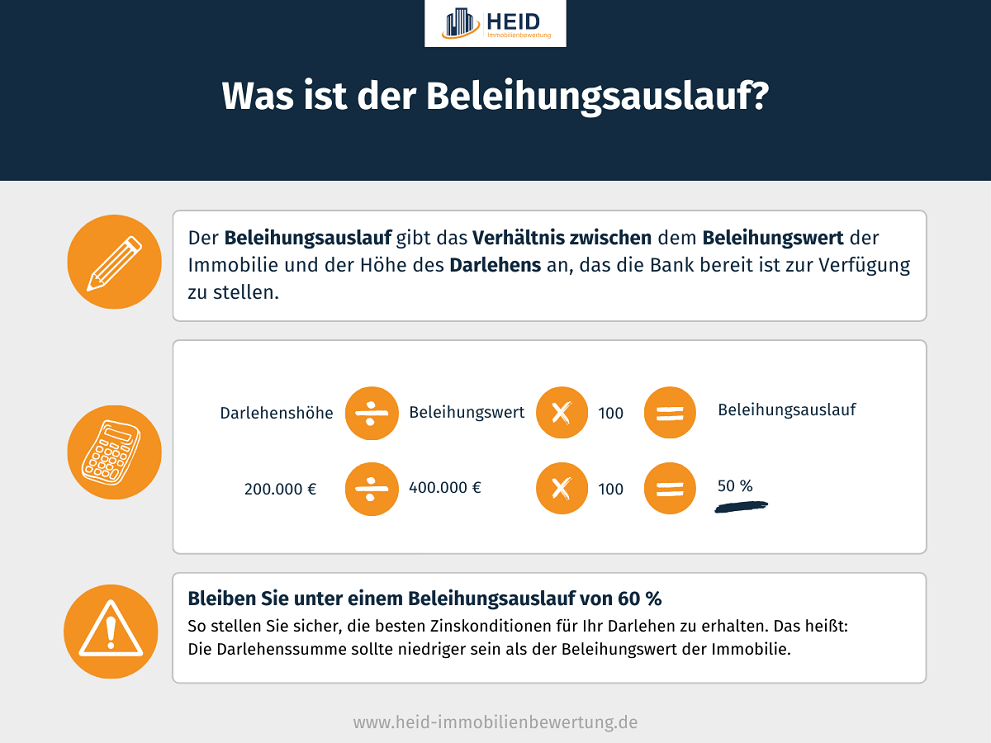 Beispiel: Liegt der Beleihungswert einer Immobilie bei 400.000 Euro und der Kreditnehmer benötigt 200.000 Euro von der Bank, liegt der Beleihungsauslauf bei 50 Prozent.