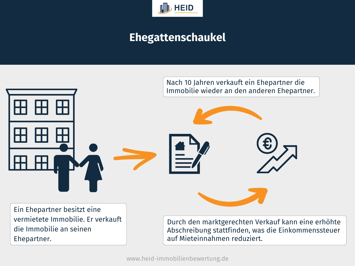 - Die Ehegattenschaukel ist ein Konzept zur steuerlichen Gestaltung, bei dem Ehepartner oder enge Verwandte Immobilien untereinander veräußern.