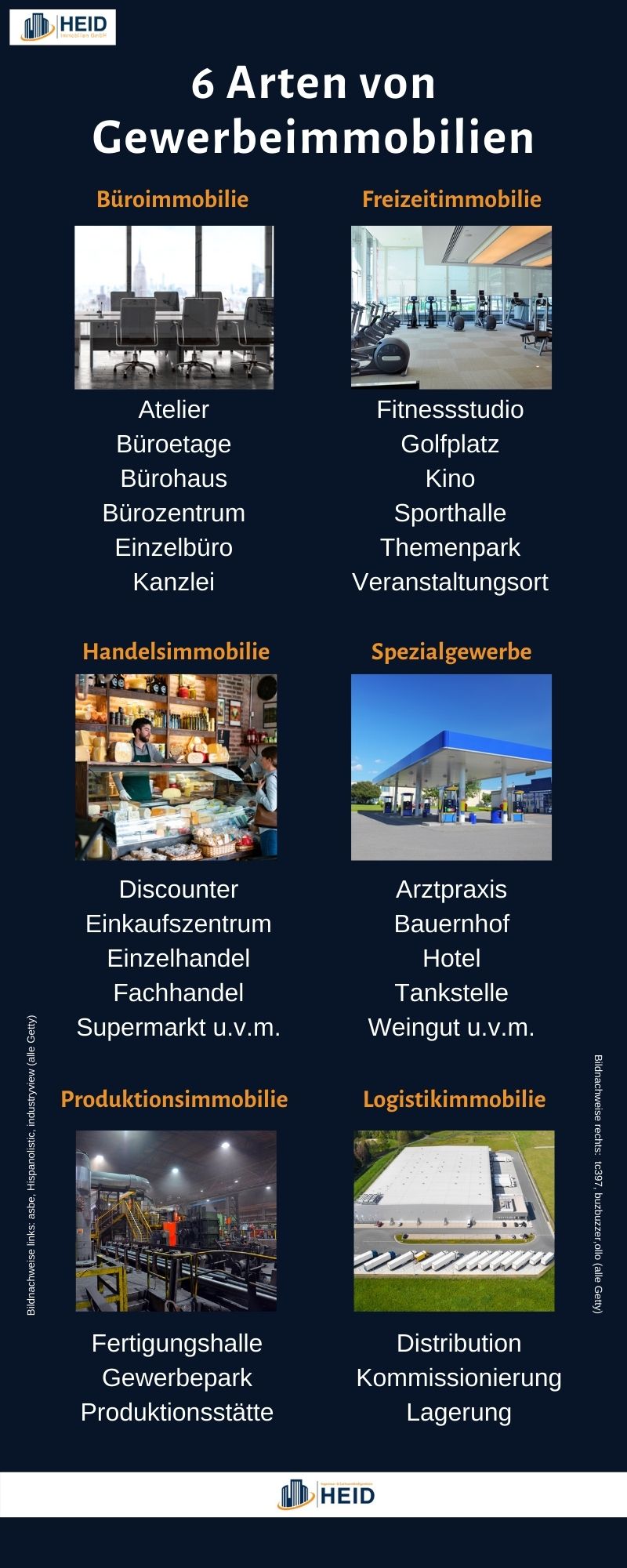 - Gewerbeimmobilien werden in sechs Kategorien unterteilt: Büro-, Freizeit-, Handels-, Logistik-, Produktions- und Spezialgewerbeimmobilien.