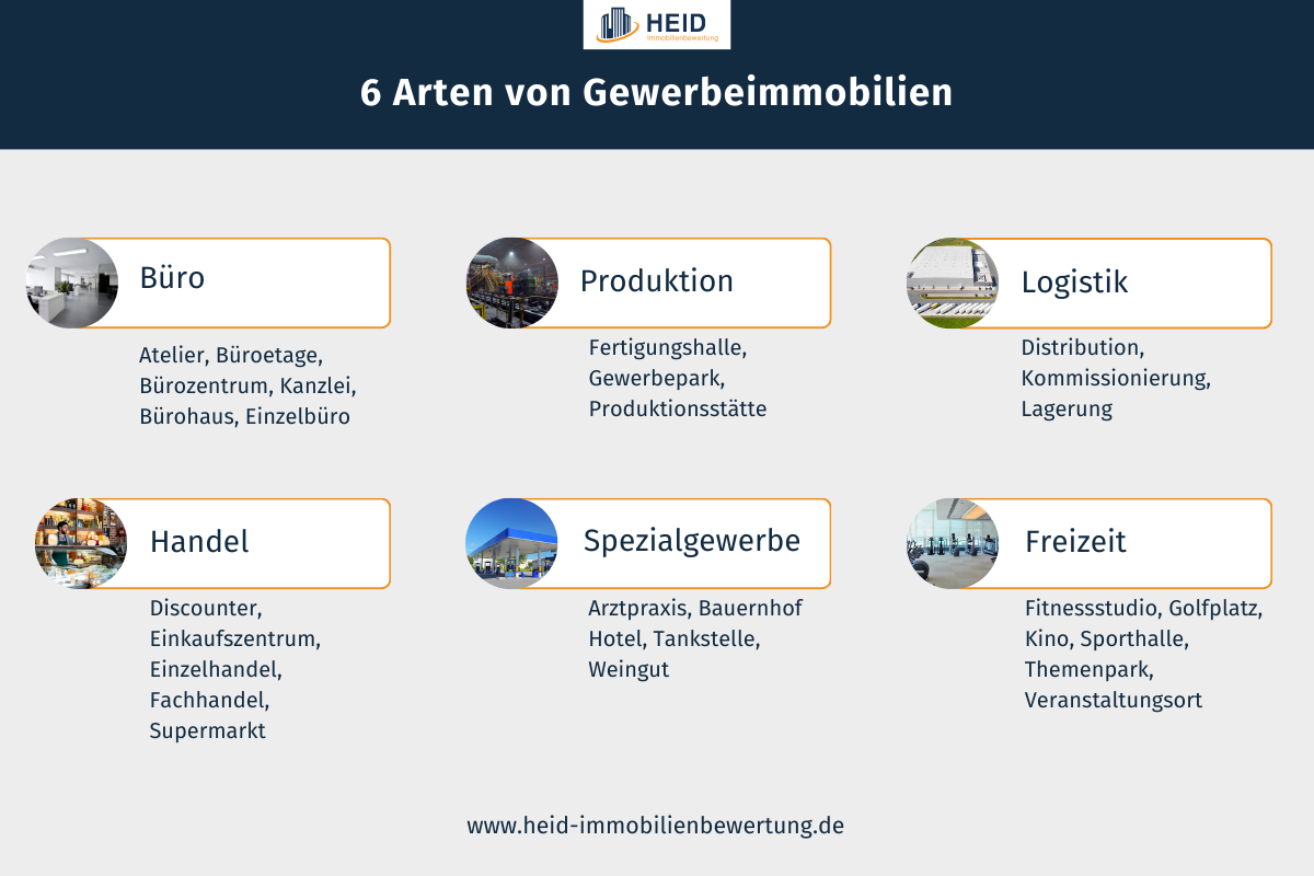 • Ge­wer­be­im­mo­bi­li­en werden in sechs Kategorien unterteilt: Büro-, Freizeit-, Handels-, Logistik-, Produktions- und Spe­zi­al­ge­wer­be­im­mo­bi­li­en.