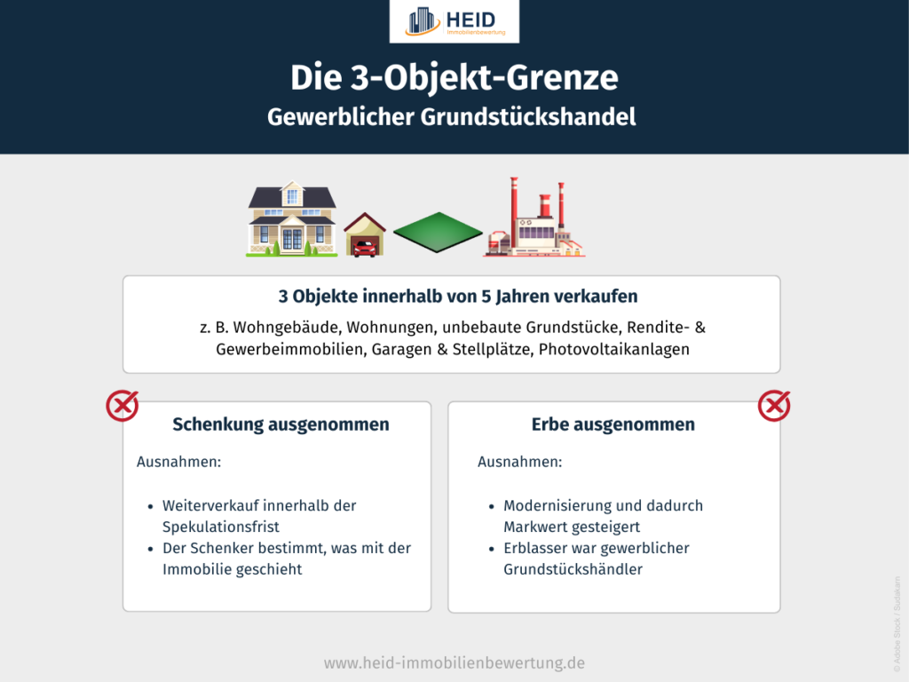 - Wer innerhalb von fünf Jahren mehr als drei Objekte verkauft, wird vom Finanzamt als gewerblicher Grundstückshändler eingestuft.