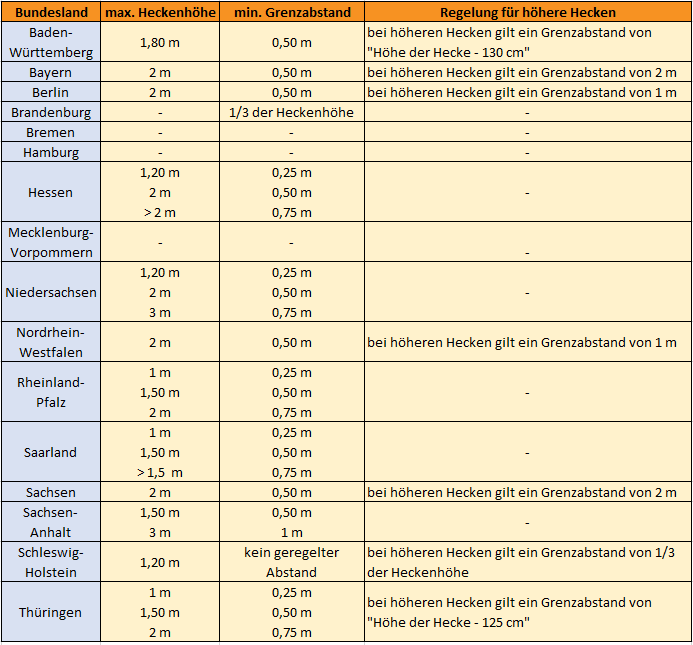 | Bundesland | max. Heckenhöhe | min. Grenzabstand | Regelung für höhere Hecken |