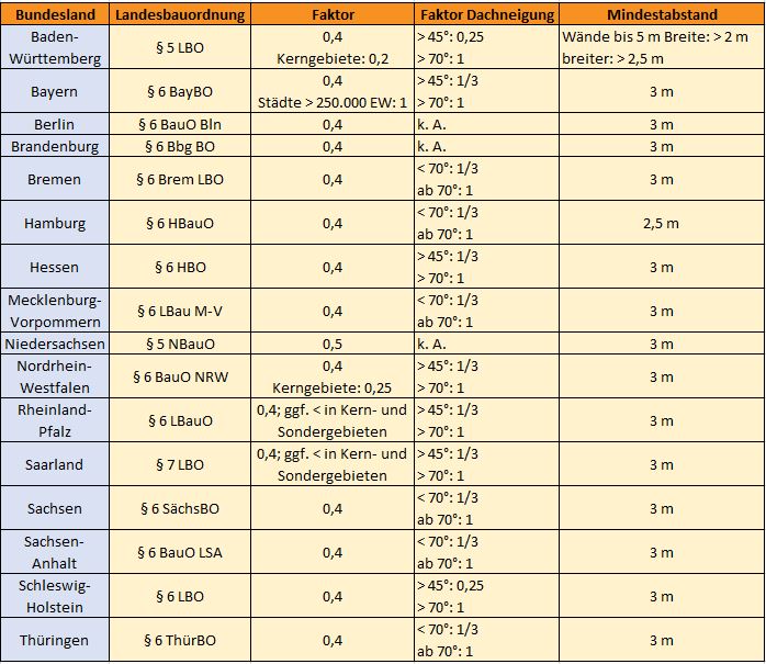 Diese Tabelle ist eine Übersicht, welche Paragraphen der jeweiligen Landesbauordnung Auskunft über Grenzbebauung geben. Die mittels des Faktors errechneten Abstandsflächen werden gegebenenfalls vom Mindestabstand laut Bauordnung (fünfte Spalte) geschlagen. Die Dachneigung gilt auch für Giebelflächen. Für Gewerbe und Industrie gelten oft geringere Abstände, meist Faktor 0,2 oder 0,25.