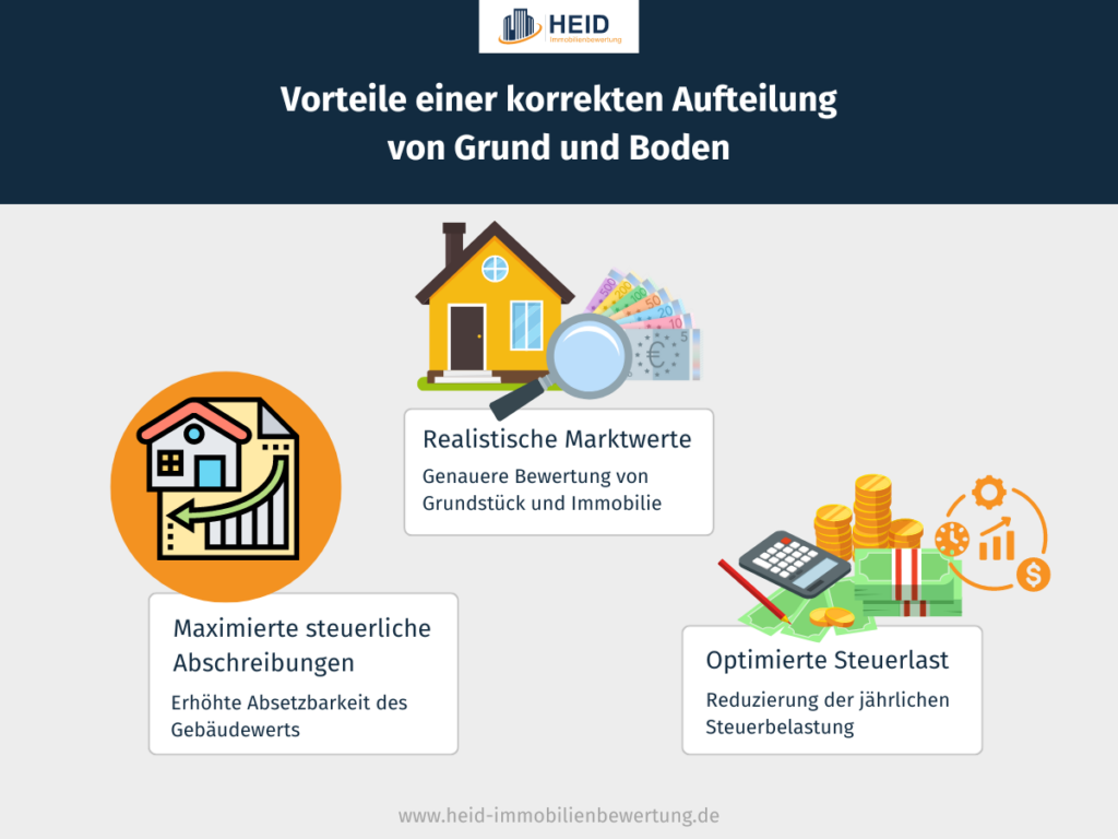 Durch eine genaue Bestimmung der Werte kann der Gebäudewert höher angesetzt werden. Dies ist besonders wichtig bei einem niedrigen Kaufpreis, da sonst kaum Abschreibungsmöglichkeiten bestehen. Ein höherer Gebäudewert führt zu einer höheren steuerlichen Abschreibung von Immobilien. Das senkt die Steuerlast. Die exakte Aufteilung von Grund und Boden sorgt somit bei entsprechenden Voraussetzungen des Grundstücks für maximale steuerliche Vorteile und eine realistische Bewertung der Immobilie.
