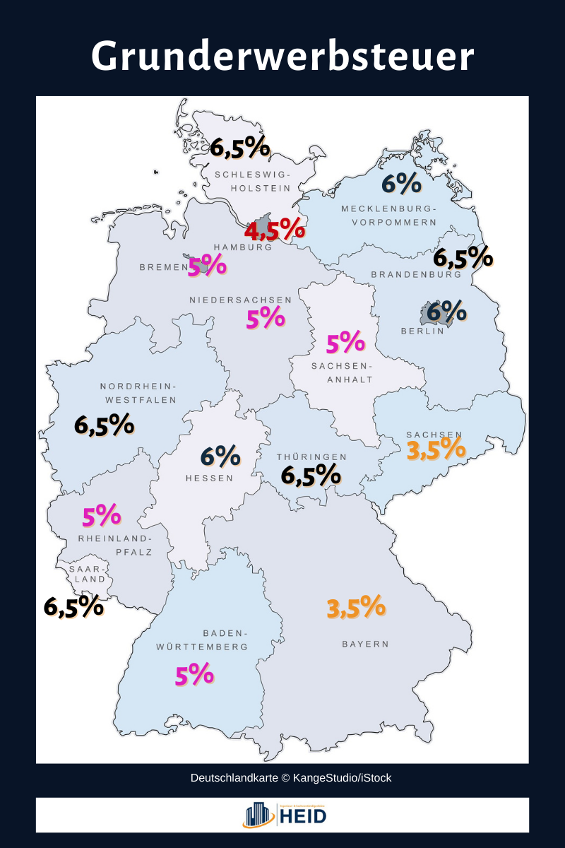- Die Grunderwerbsteuer beträgt in Deutschland, je nach Bundesland, zwischen 3,5 und 6,5 Prozent des Kaufpreises und bessert die Haushalte der Länder auf. Die konkrete Höhe der Grunderwerbsteuer richtet sich also danach, wo Sie ein Grundstück erwerben.