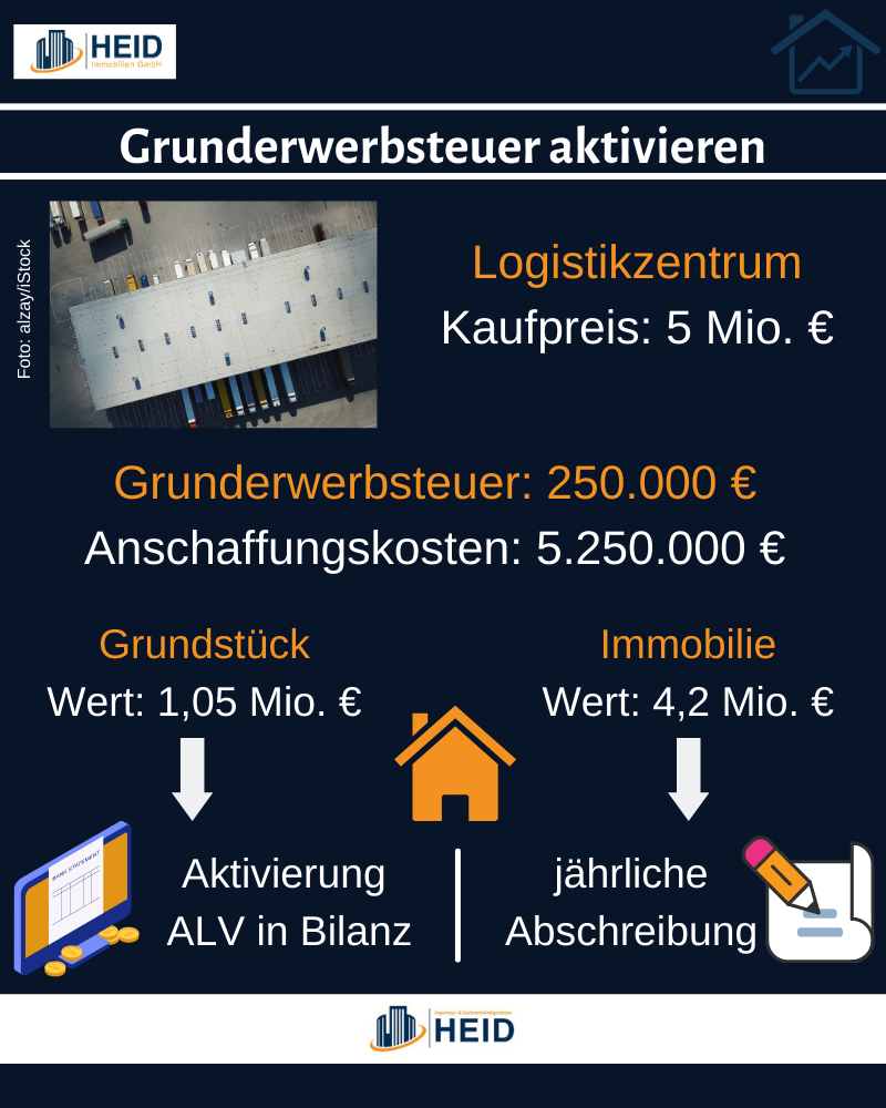 Durch die Aktivierung der Grunderwerbsteuer belaufen sich die Anschaffungskosten für das Logistikzentrum auf 5.250.000 Euro.