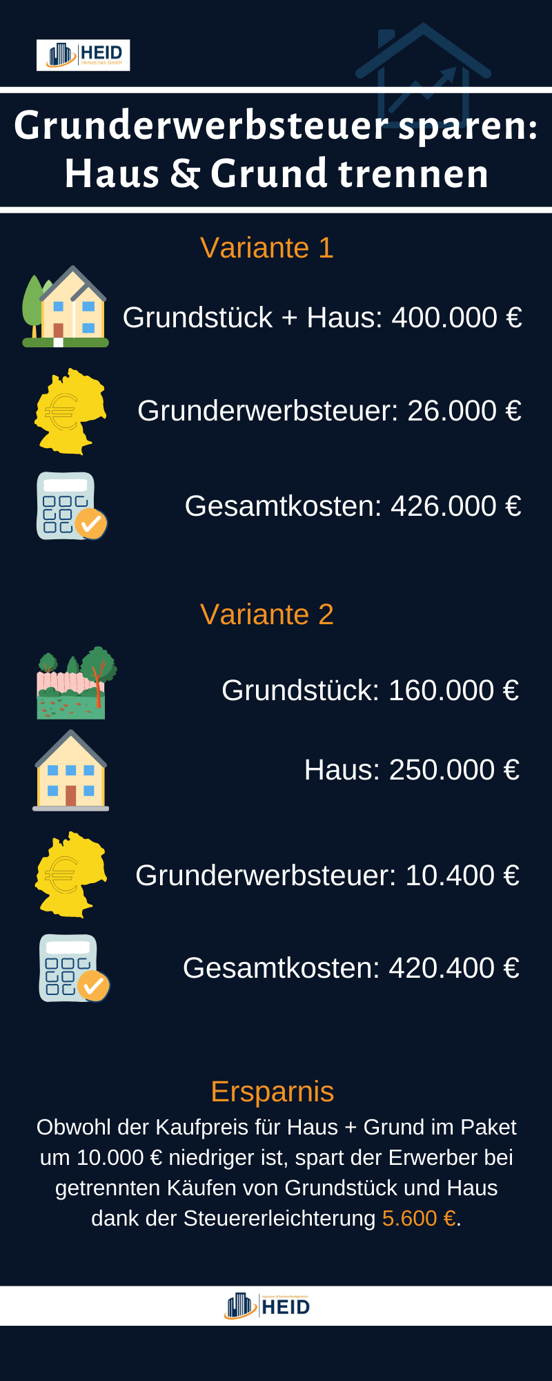 Zum Vergleich: Bei einem Erwerb von Haus und Grundstück aus einer Hand zu einem vergünstigen Komplettpreis von 650.000 Euro blieben beim Finanzamt 29.250 Euro Grunderwerbsteuer hängen. Die Gesamtkosten für das Hausbauprojekt hätten 679.250 Euro betragen. Der Trick hatte trotz eines günstigeren Angebots für den Erwerb aus einer Hand noch ein Einsparpotenzial von 3.050 Euro!