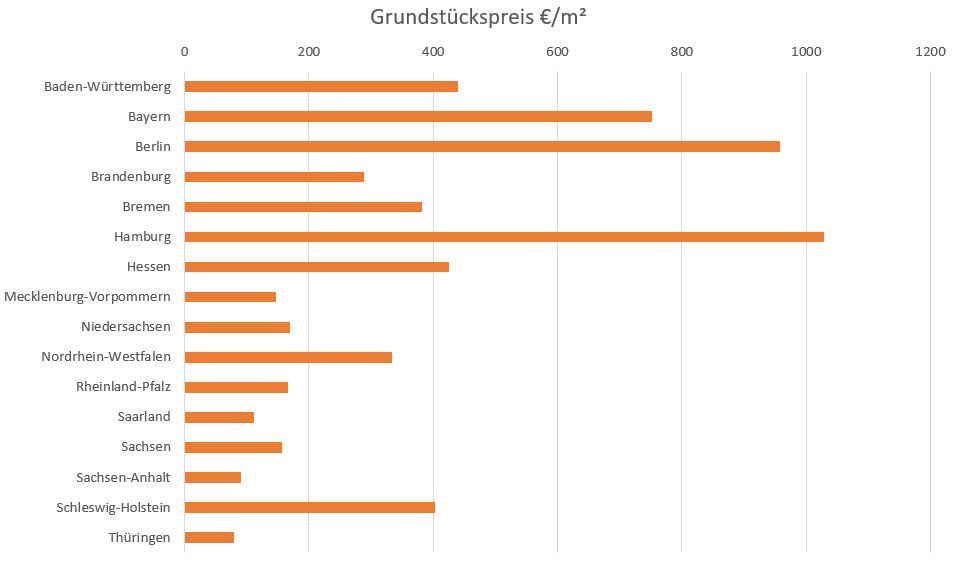 Darüber hinaus unterscheidet sich der Grundstückspreis nach Lage. Im Schnitt sind Hamburg, Berlin und Bayern die teuersten Pflaster für den Grundstückskauf, während die Verkehrswerte für Baugrundstücke in weiten Teilen Sachsen-Anhalts und Thüringen vergleichsweise niedrig sind.