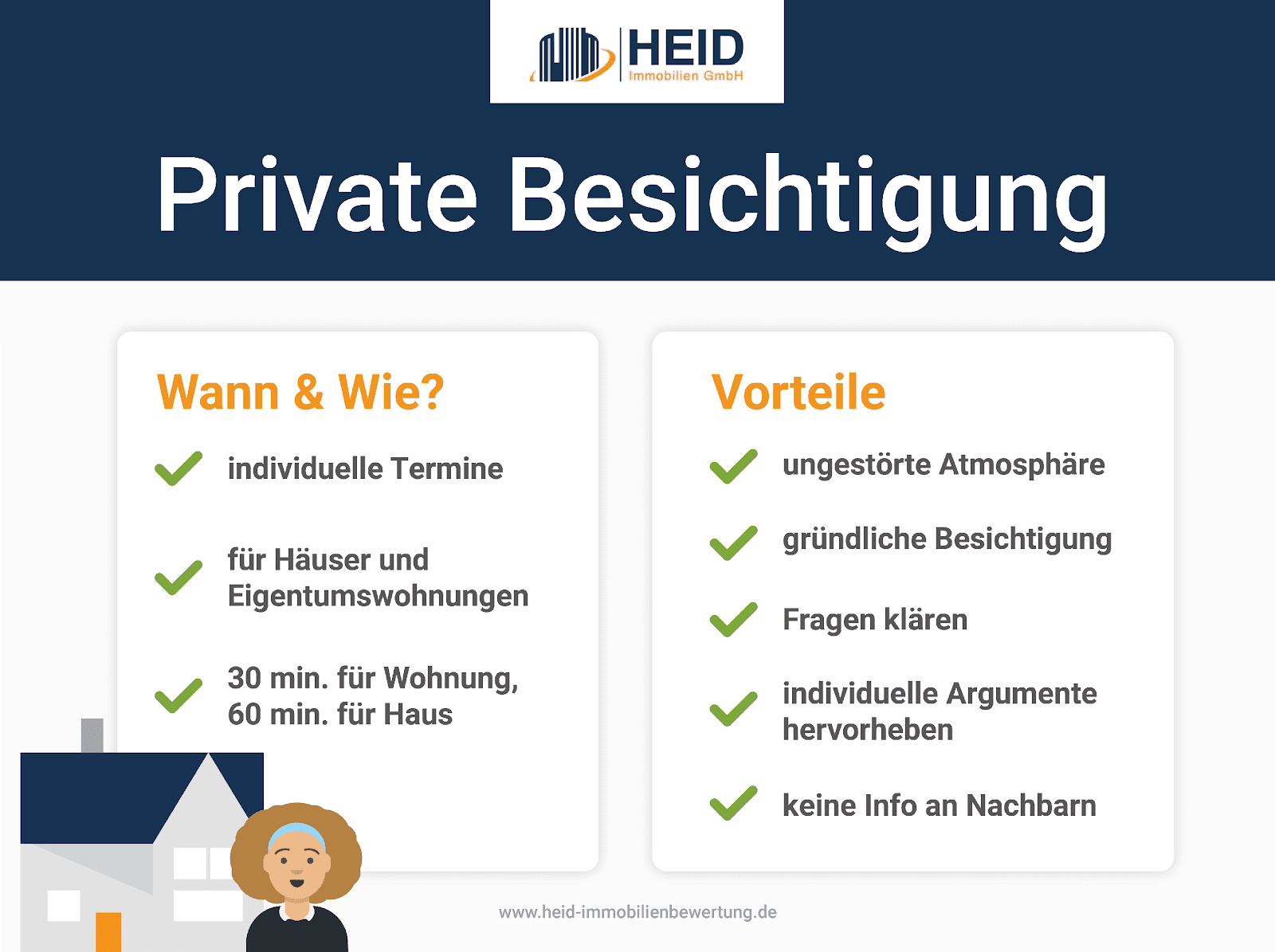 Unterstützung erhalten Sie im Vorfeld durch eine Immobilienverkaufsberatung. Ihren Verkaufspreis können Sie gegenüber skeptischen Käufern durch ein Gutachten rechtfertigen. Das geschieht im Optimalfall durch einen neutralen Dritten mit Fachkompetenz wie den renommierten Gutachtern der Heid Immobilienbewertung.