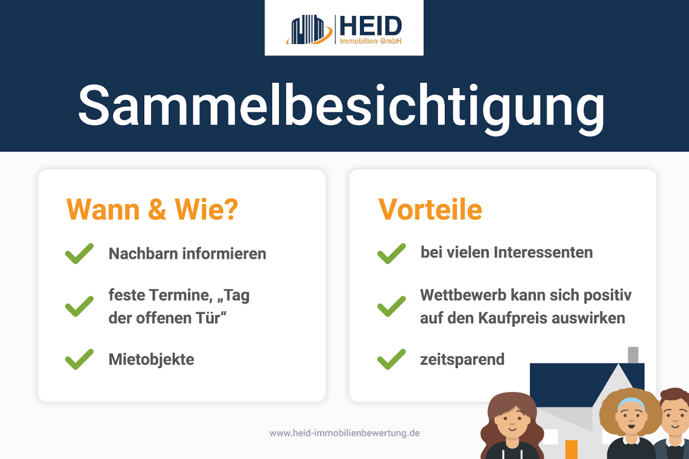 Bei einer Sammelbesichtigung laden Sie mehrere Interessenten ein, das Haus zu einem festgelegten Zeitpunkt gleichzeitig zu besichtigen. Das spart natürlich Zeit. Auch kann der hier entstehende Wettbewerb das Interesse am Kauf erhöhen und dadurch eventuell den Kaufpreis positiv beeinflussen.