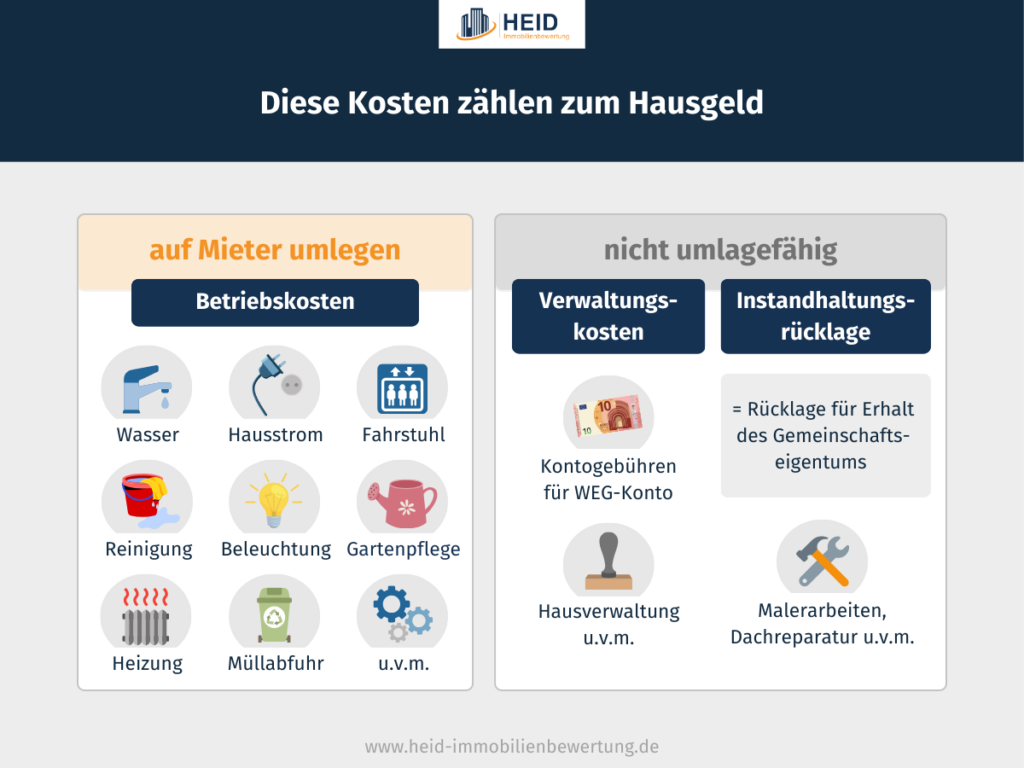 - Das Hausgeld deckt alle laufenden Nebenkosten sowie geplante Investitionen ab. Typische Posten, die zum Hausgeld zählen, sind zum Beispiel Kosten für Instandhaltung, Hausstrom und Abfallentsorgung.
