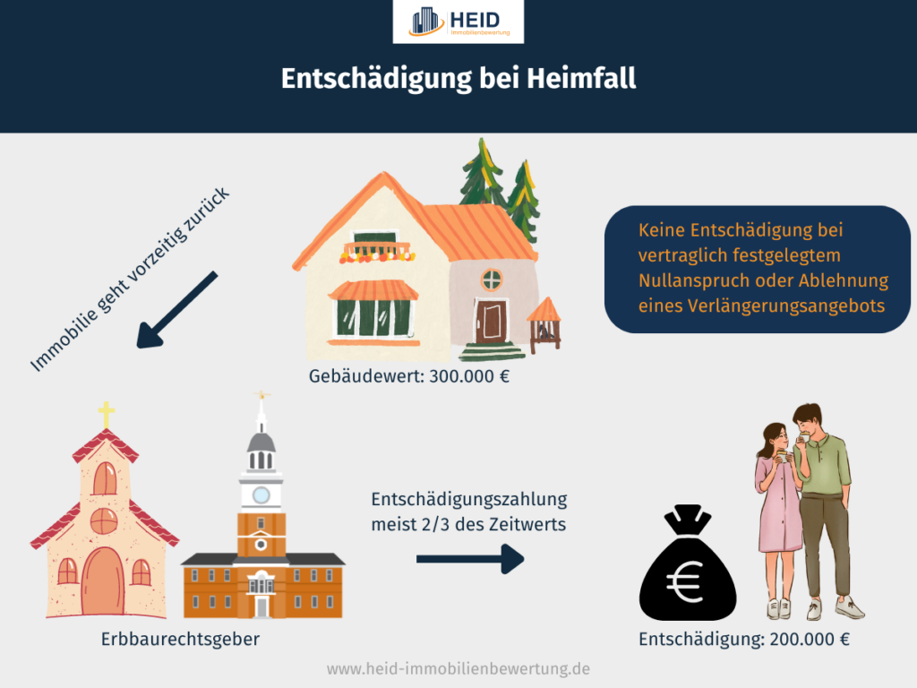 Läuft ein Erbbaurecht aus oder der Grundstückseigentümer macht von seinem Heimfallanspruch Gebrauch, sieht der Gesetzgeber vor, dass der Erbbaugeber den Erbbauberechtigten für die von ihm errichteten Gebäude entschädigen muss. Bei einem Heimfall im Erbbaurecht mit Entschädigung gelten zwei Drittel des Zeitwerts der Immobilien gemäß § 32 ErbbauRG als angemessen.