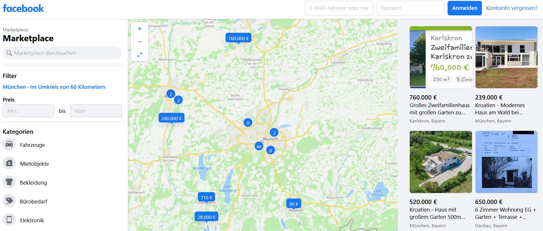 Über den Facebook Marketplace können Sie auch Immobilien verkaufen. Sie erstellen mit Ihrer Immobilienanzeige im Facebook Marketplace ein öffentliches Inserat, das laut Facebook ohne Begrenzung „im Marketplace sowie im News Feed, in der Suche und an anderen Stellen innerhalb und außerhalb von Facebook gesehen werden kann“. Das Inserat ist kostenlos, die Gestaltungsmöglichkeiten einschließlich 360°-Bilder recht üppig, aber Facebook sammelt reichlich Daten. Vor Einführung des Facebook Marketplace, der eine Mischung aus lokalem Flohmarkt und eBay Kleinanzeigen darstellt, wurde bereits fleißig über private Facebook-Gruppen verkauft.