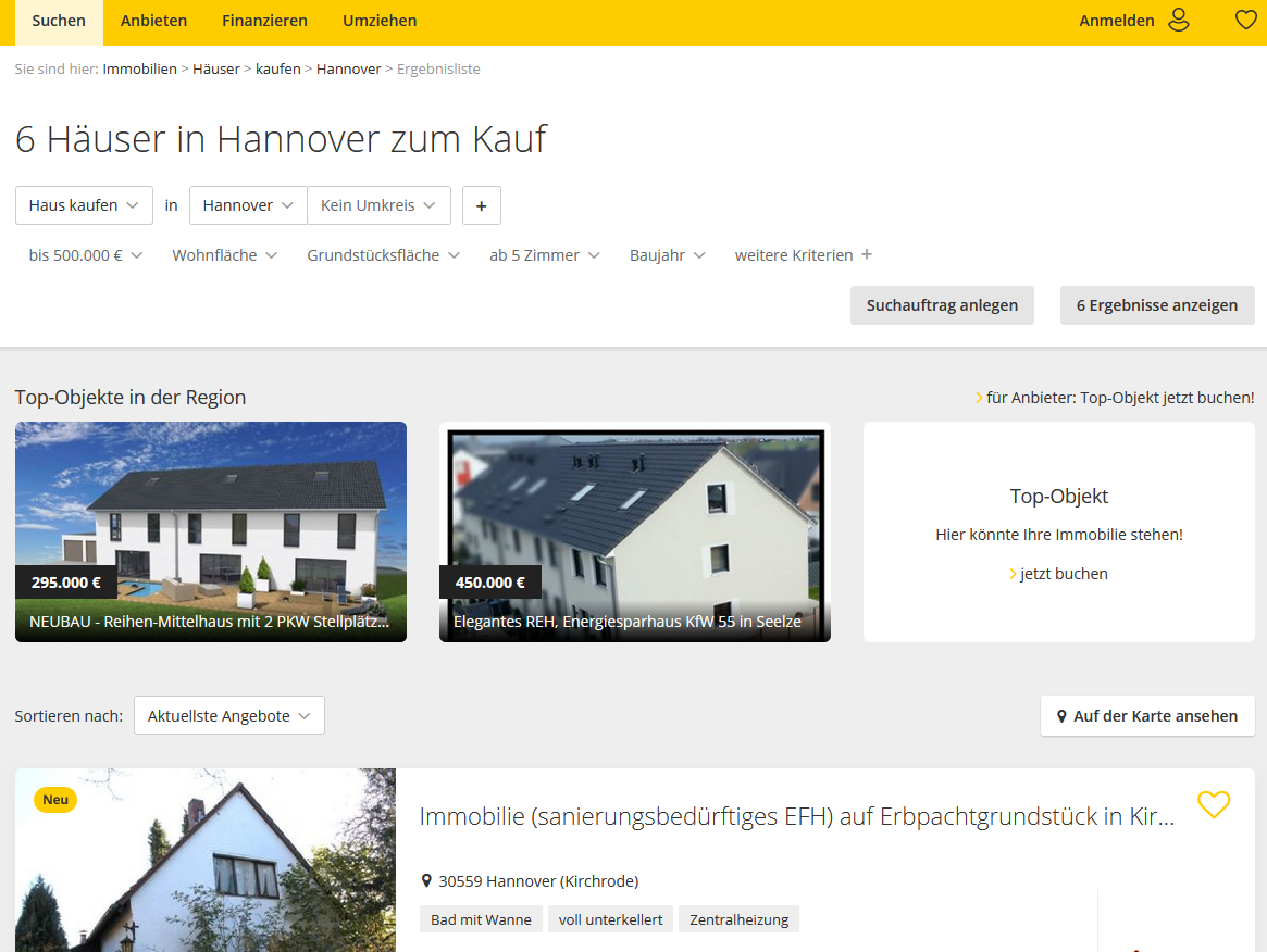 Immobilienscout24 ist der Platzhirsch unter den Online-Anzeigenportalen für Immobilien. Immoscout24 gehört zu den zehn größten Anzeigenportalen für Immobilien weltweit. Hier finden alle Arten von Immobilien Abnehmer. Allerdings sind die Filtermöglichkeiten für Gewerbeimmobilien eingeschränkt. Für den privaten Verkauf von Wohnimmobilien ohne Makler bietet Immobilienscout24 dagegen vielfältige Möglichkeiten. Die Einrichtung und Bedienung sind leicht und intuitiv. Wie viel Ihre Anzeige kostet, erfahren Sie erst, nachdem Sie alle Daten eingegeben haben. Der Platzhirsch ist bei seinen Anzeigenpreisen etwas teurer als die Konkurrenz. Er liefert zwar die größte Reichweite, allerdings kommen über Immobilienscout24 auch einige (Fake-)Anfragen von unseriösen Profilen rein. Nach Ablauf der Buchungszeit verlängert sich Ihr Inserat automatisch, sofern Sie die Anzeige nicht rechtzeitig deaktivieren.