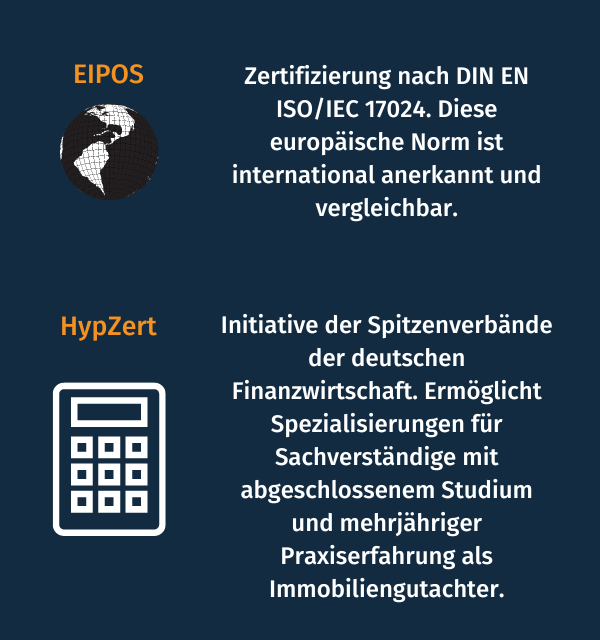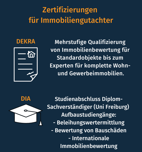 - zertifizierte Immobiliengutachter: Es gibt zahlreiche Spezialgebiete und dementsprechende Zertifizierungen für Immobiliengutachter. Zu den wichtigsten Zertifizierungsstellungen gehören neben der IHK die Institutionen DEKRA und TÜV sowie HypZert. Auch anerkannt und respektiert sind Auszeichnungen von DIA und EIPOS.
