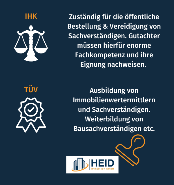 - öffentlich bestellte und vereidigte Immobiliengutachter und -sachverständige : Hierbei handelt es sich um Experten, die von der Industrie- und Handelskammer (IHK) geprüft und ernannt werden. Ihre Bezeichnung ist gesetzlich geschützt und ihre Gutachten sind vor Gericht zugelassen.