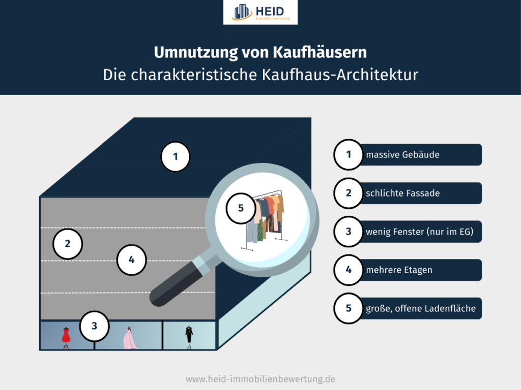 Tipp: Sie benötigen einen realistischen Wert Ihrer Immobilie, der Ihnen als Basis für Verkauf oder Umnutzungsvorhaben dient? Die Gutachter der Heid Immobilienbewertung haben umfassende Erfahrung mit der Bewertung von komplexen Spezialimmobilien, wie es auch Kaufhäuser sind. Nehmen Sie Kontakt zu uns auf und lassen Sie sich in einem Beratungsgespräch kostenfrei und unverbindlich beraten!