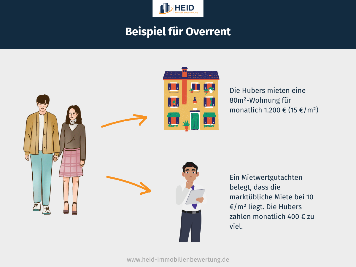 Die Wohnung hat eine Fläche von 80 Quadratmetern. Die Hubers zahlen somit eine monatliche Miete von 1.200 Euro (15 Euro x 80 m²), während die marktübliche Miete nur 800 Euro (10 Euro x 80 m²) betragen würde. Daraus ergibt sich ein Overrent von 400 Euro, den die Mieter monatlich „zu viel“ zahlen.