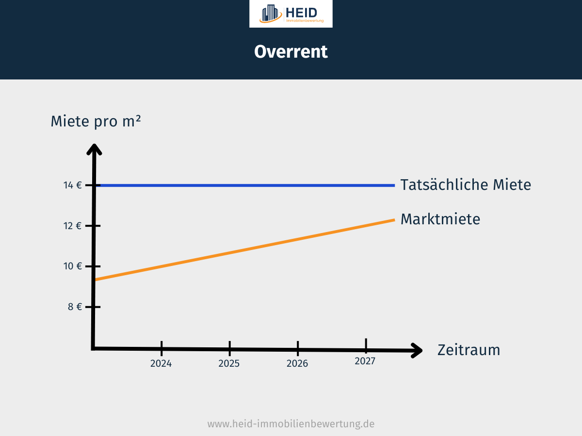 - Bei Gewerbeimmobilien kann Overrent den Immobilienwert beeinflussen, da langfristige Mietverträge mit überhöhten Mieten im Ertragswertverfahren als temporärer Mehrertrag berücksichtigt werden.