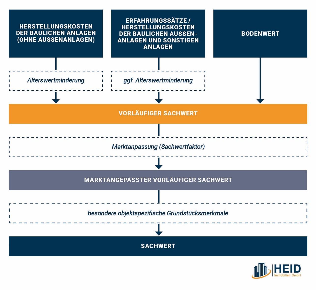 Um den Gebäudesachwert zu ermitteln, werden die Regelherstellungskosten pro Quadratmeter Bruttogrundfläche des Gebäudes berechnet und mit dieser Fläche multipliziert. Davon abgezogen wird die Alterswertminderung, um den aktuellen Sachwert des Gebäudes zu bestimmen.