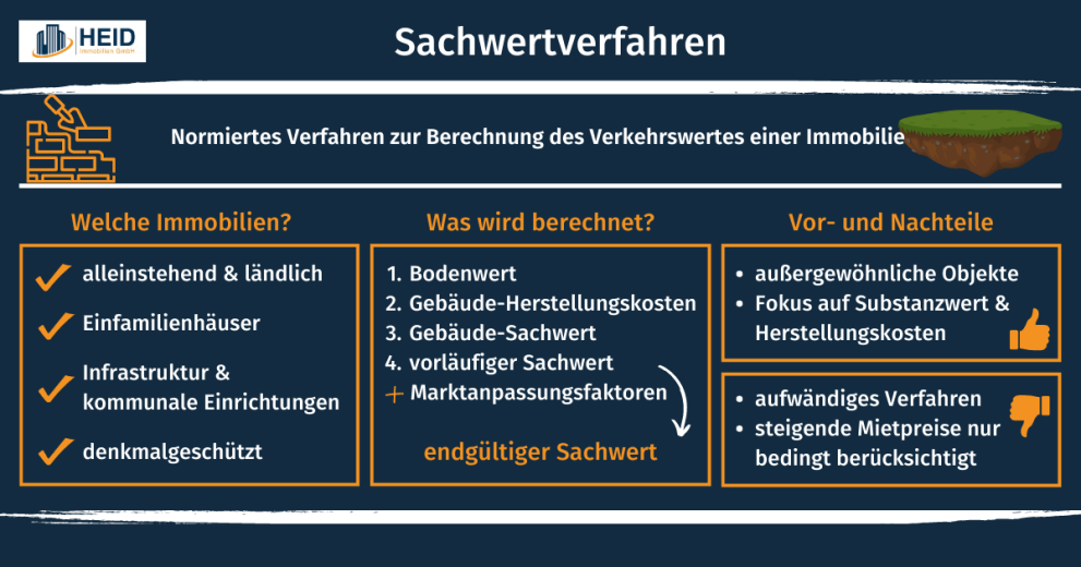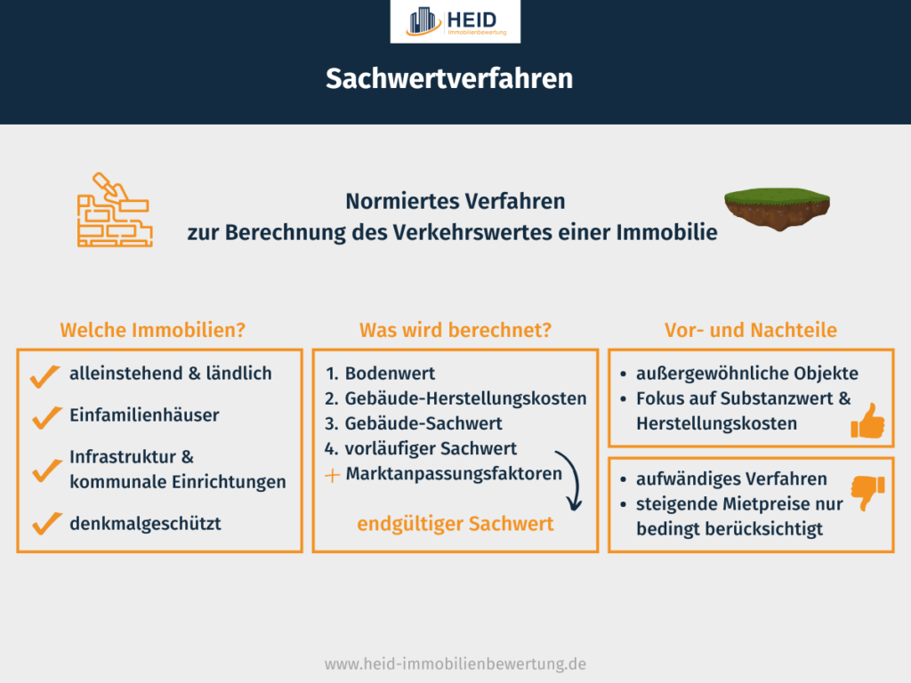 - Das Sachwertverfahren bezieht sich auf die Herstellungskosten, angepasst an den Baupreisindex.