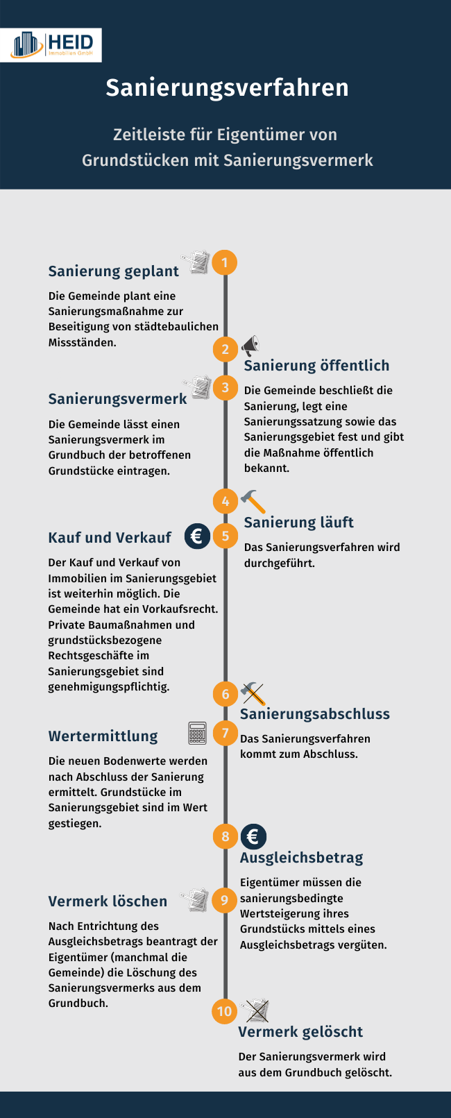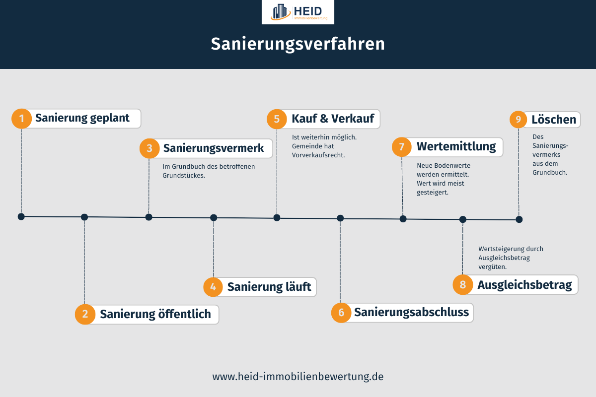 Ein im Grundbuch eingetragenes Sanierungsverfahren seitens der Gemeinde läuft in drei Phasen ab: Vorbereitung, Durchführung und Abschluss.