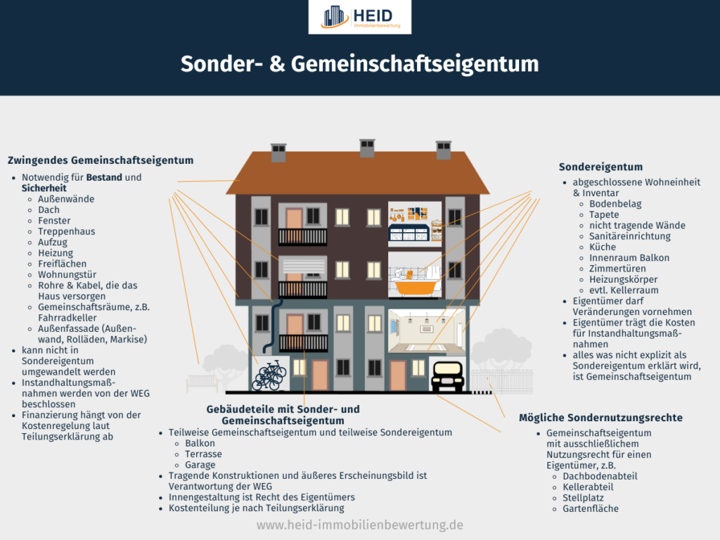 - Einige Bestandteile, wie Balkone oder Fenster, sind nur teilweise Sondereigentum und zählen in bestimmten Bereichen zum Gemeinschaftseigentum.