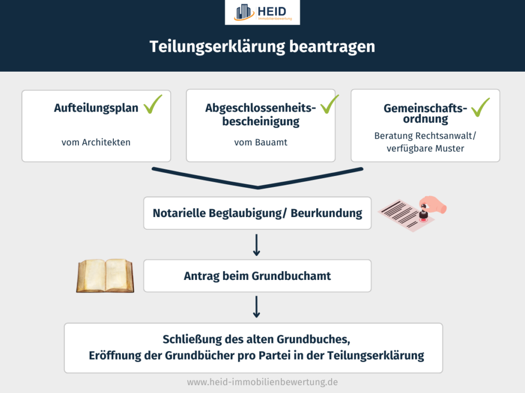 - Für die Beantragung einer Teilungserklärung benötigen Sie den Aufteilungsplan mit bestätigter Abgeschlossenheitsbescheinigung vom Bauamt und, sofern Sie abweichende Regelungen vom Wohnungseigentumsgesetz wünschen, eine rechtskräftige Gemeinschaftsordnung. Die drei Dokumente müssen durch einen Notar beglaubigt oder beurkundet werden. Dann können Sie die Anlegung von Grundbüchern für verschiedene Wohnungen beim Grundbuchamt beantragen.