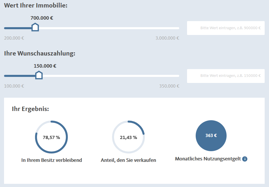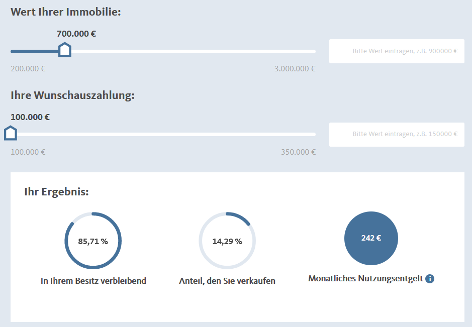 Ist Ihre Immobilie beispielsweise 750.000 Euro wert und Sie möchten daraus über einen Teilverkauf 100.000 Euro generieren, müssen Sie beim Anbieter wertfaktor Immobilien GmbH 14,29 % verkaufen und monatlich 242 Euro Nutzungsentgelt entrichten.