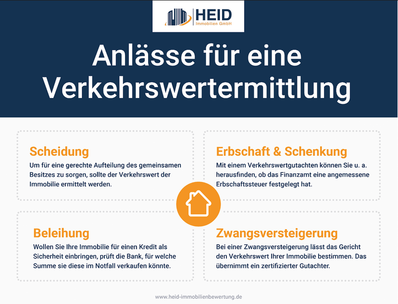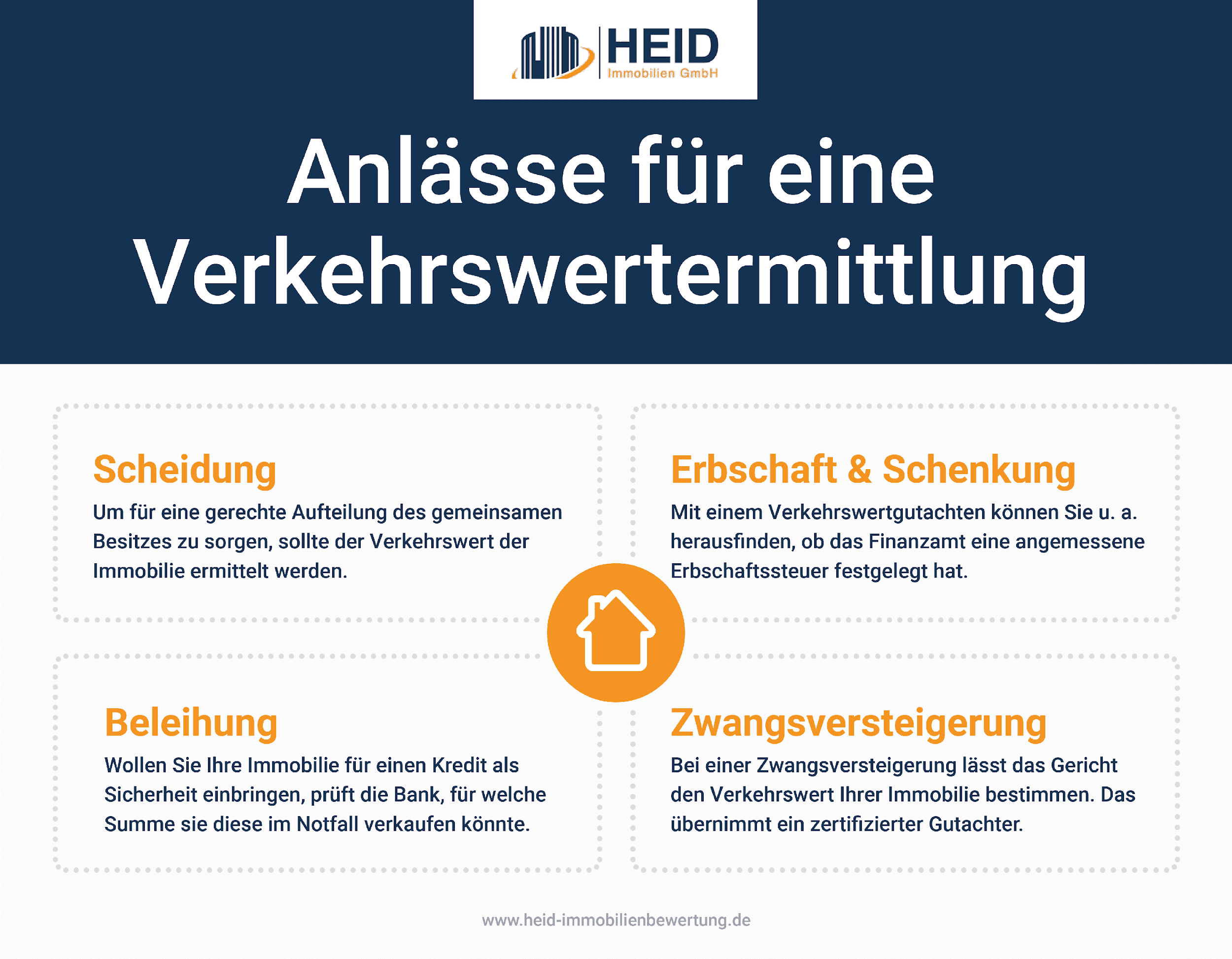 - Den Verkehrswert einer Immobilie benötigen Sie, wenn sie ihren Eigentümer wechselt. Mögliche Anlässe sind Kauf, Verkauf, Scheidung, Erbschaft, Zwangsversteigerung, Unternehmensbewertung oder eine steuerliche Wertermittlung durch das Finanzamt.