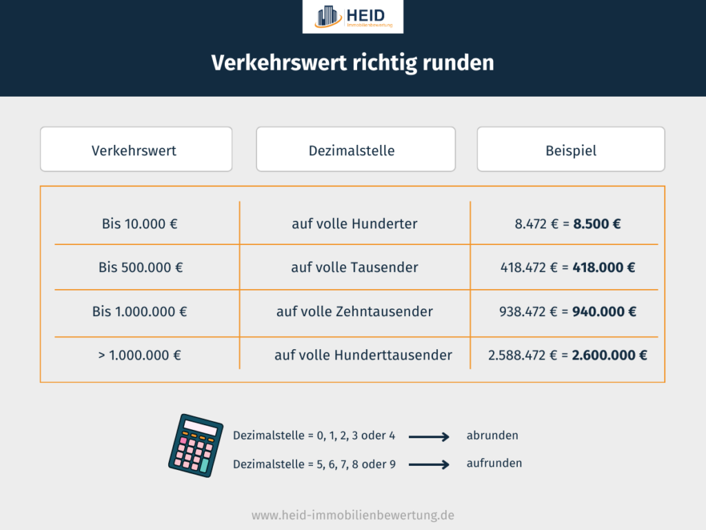 Der berechnete Verkehrswert wird gerundet, um eine praxisnahe und marktgerechte Darstellung zu gewährleisten. Die Rundungsregeln hängen von der Höhe des Verkehrswerts ab. In der folgenden Übersicht sehen Sie, wie Sachverständige den Verkehrswert ermitteln und anschließend korrekt runden.