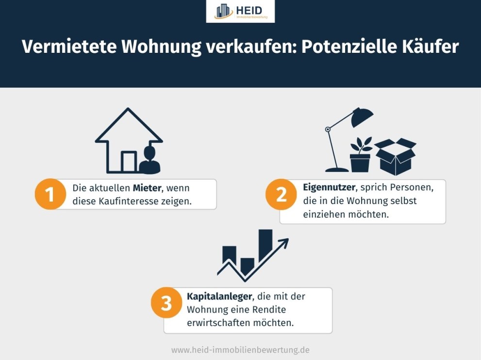 - Zielgruppe für den Verkauf einer vermieteten Eigentumswohnung sind hauptsächlich die aktuellen Mieter oder Kapitalanleger.